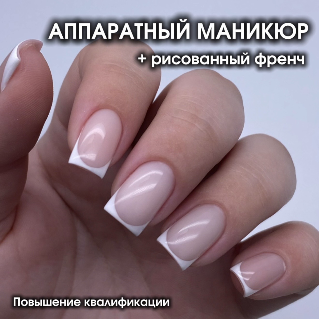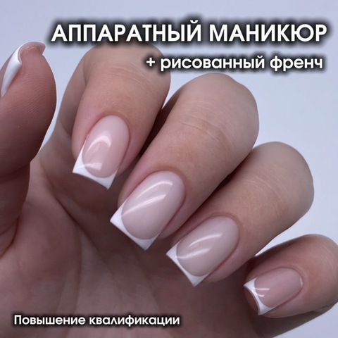 12:00 – 19:30 – практика на модели. Аппаратный маникюр + укрепление натуральных ногтей. Форма квадрат. Прорисовка френча.